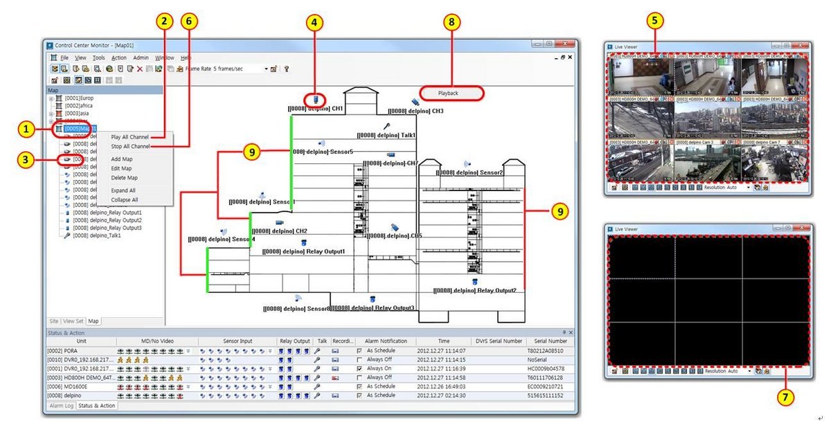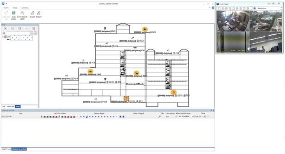 Sie können in den KARTEN-MODUS wechseln, indem Sie unten im Einheitenlistenfenster auf „MAP“ klicken. Im Kartenmodus können Sie die Kamera, den Audioausgang, den Relaisausgang, den Sensor und das Mikrofon auf der Karte registrieren und steuern. Eine kleinen Karte wird dadurch um einen Ebenen-Typ erweitert. Der Betriebsstatus und die Ereignisse werden auf der Karte angezeigt. So erhält der Administrator den Status der registrierte Einheiten optisch in Echtzeit.