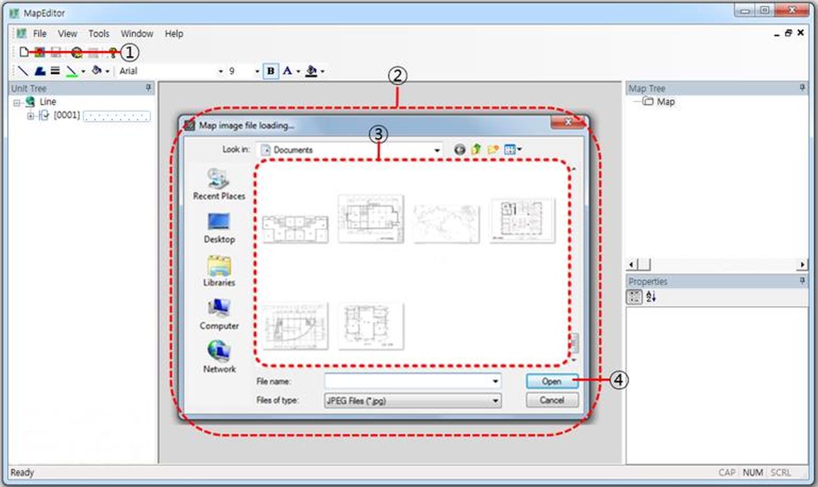 Wenn Sie im Karteneditor auf das Symbol ① klicken, wird das Fenster ② „Laden der Kartenbilddatei“ angezeigt. Wählen Sie dann den Pfad zum entsprechenden Verzeichnis aus und ③ selektieren Sie die gewünschte Kartendatei, ④ klicken Sie abschließend auf die Schaltfläche [Open] um diese dann im Kartenfenster zu verwenden.